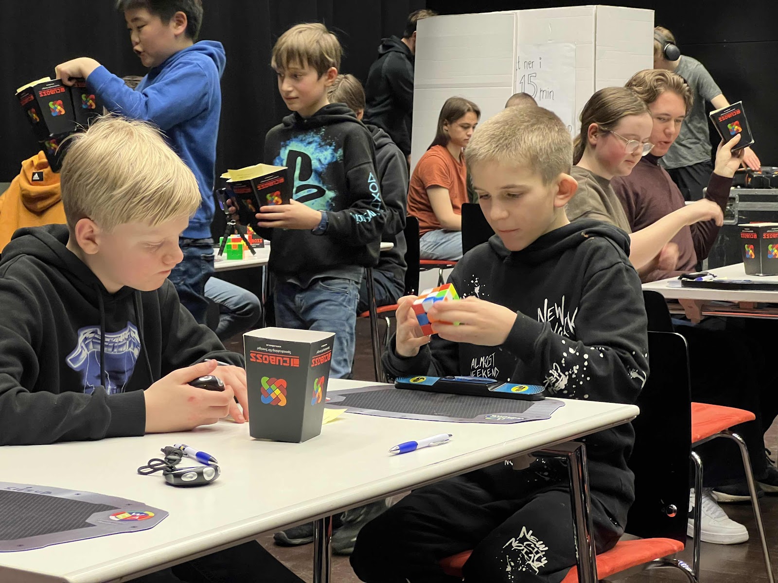 Han skulle tävla i 3 grenar, första var Pyraminx sen var det vanliga 3x3x3.