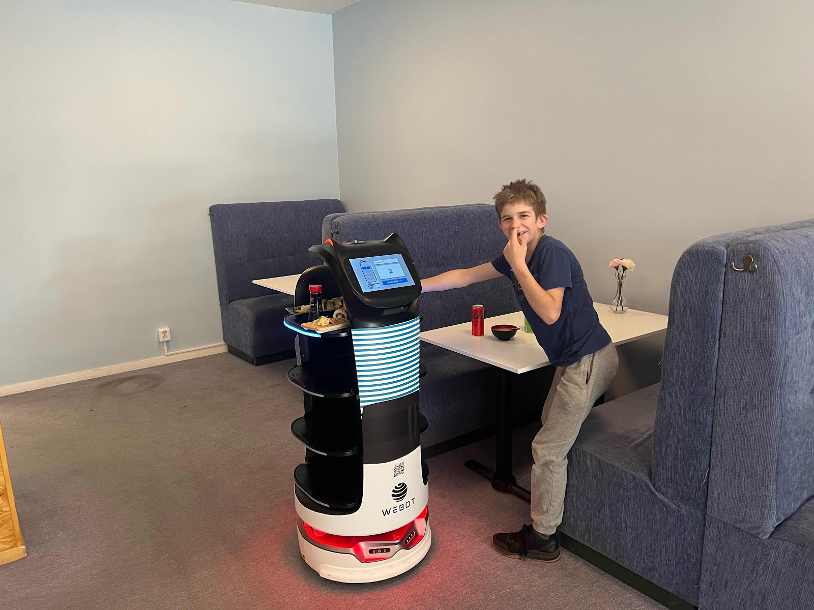 Drog en snabb middag i Bollnäs där vi blev serverade av en robot till Oskars förtjusning.