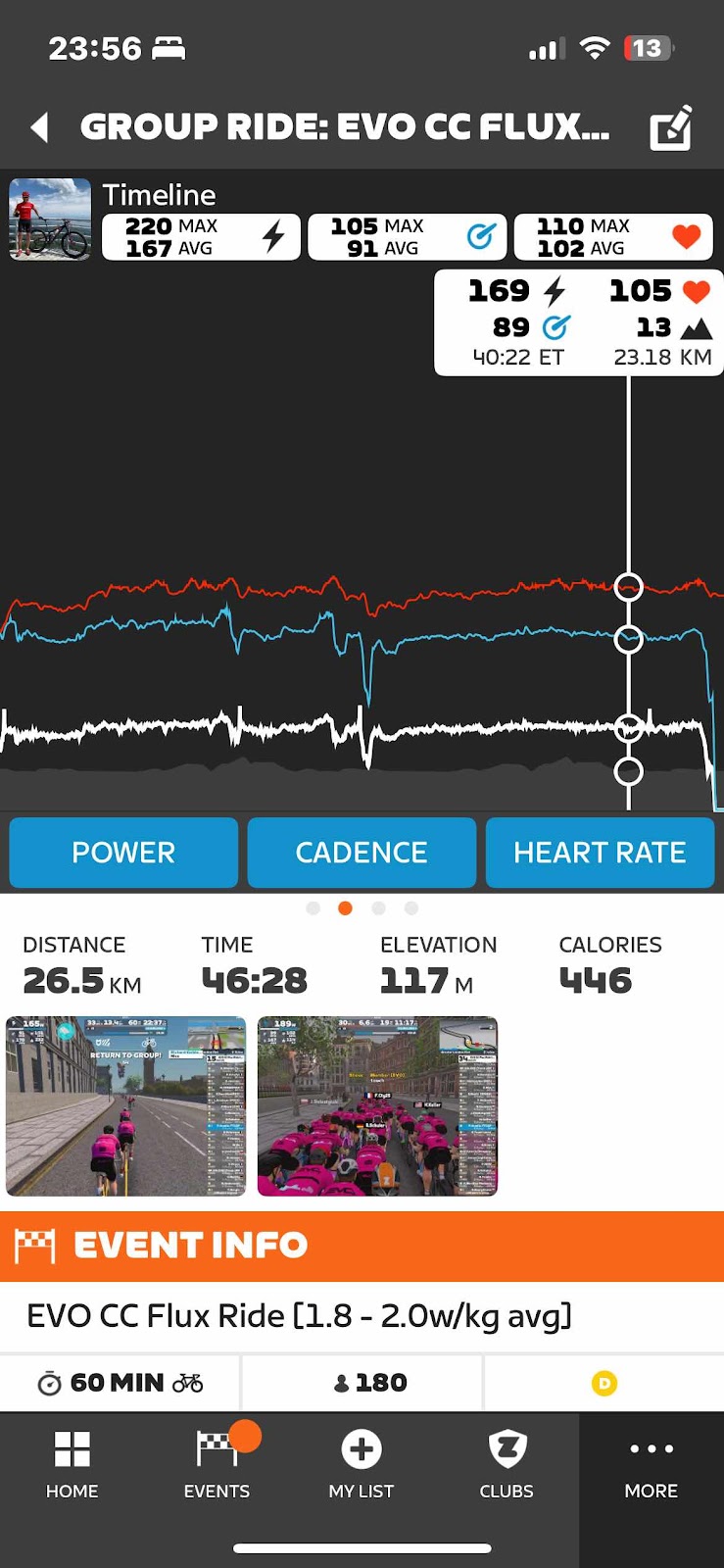 Blev ett jämt och fint tempo på runt 170 watt och 90 i kadens.